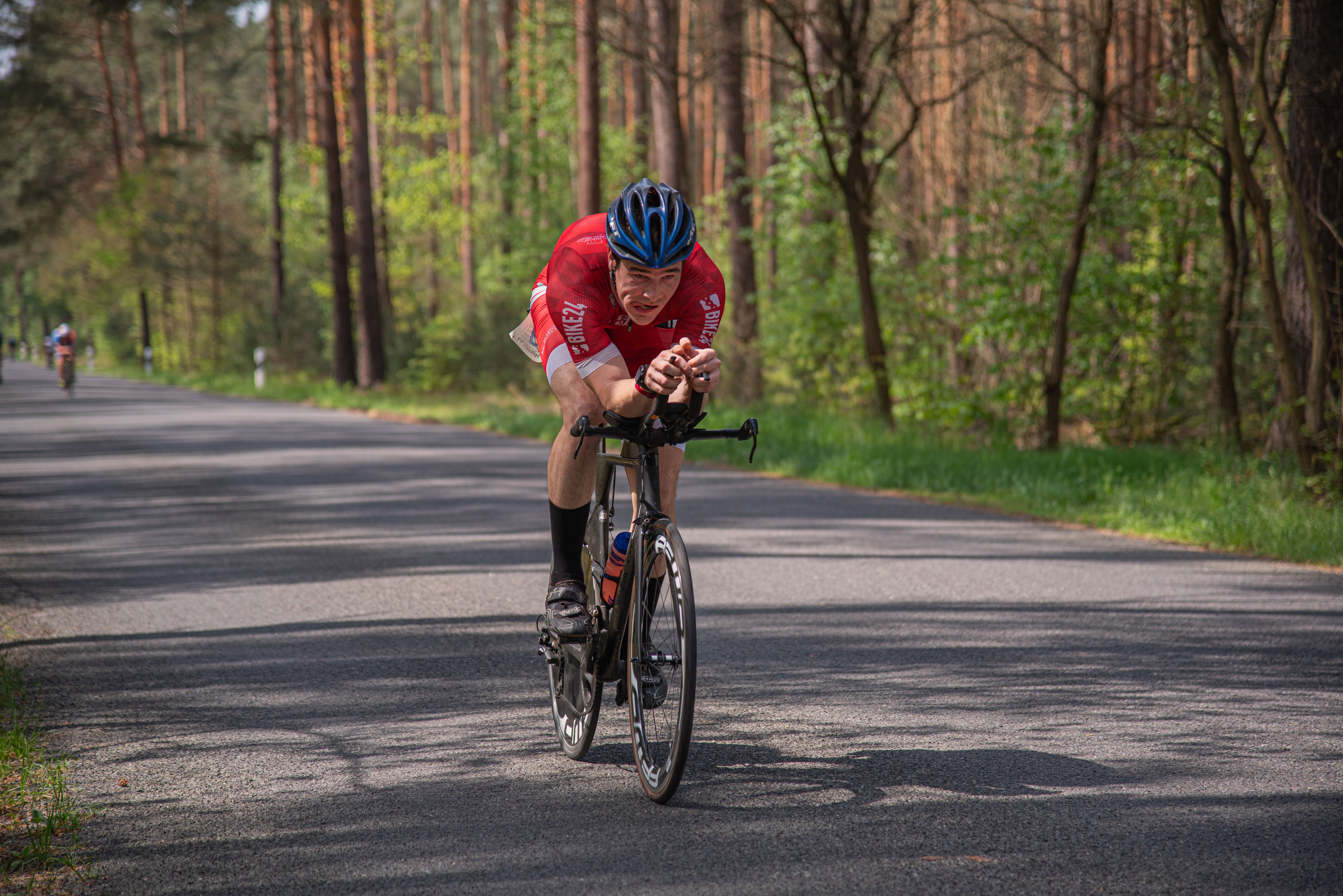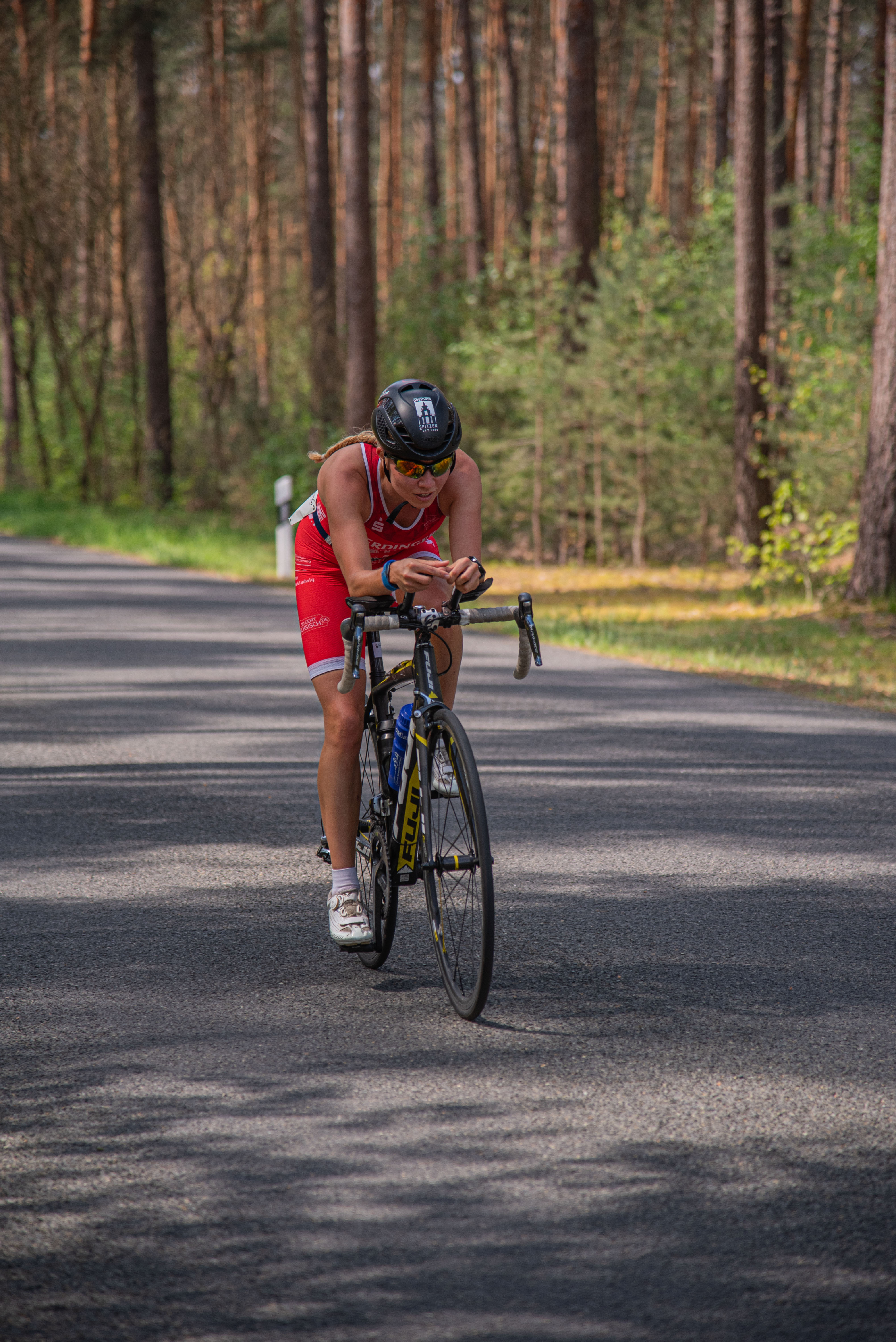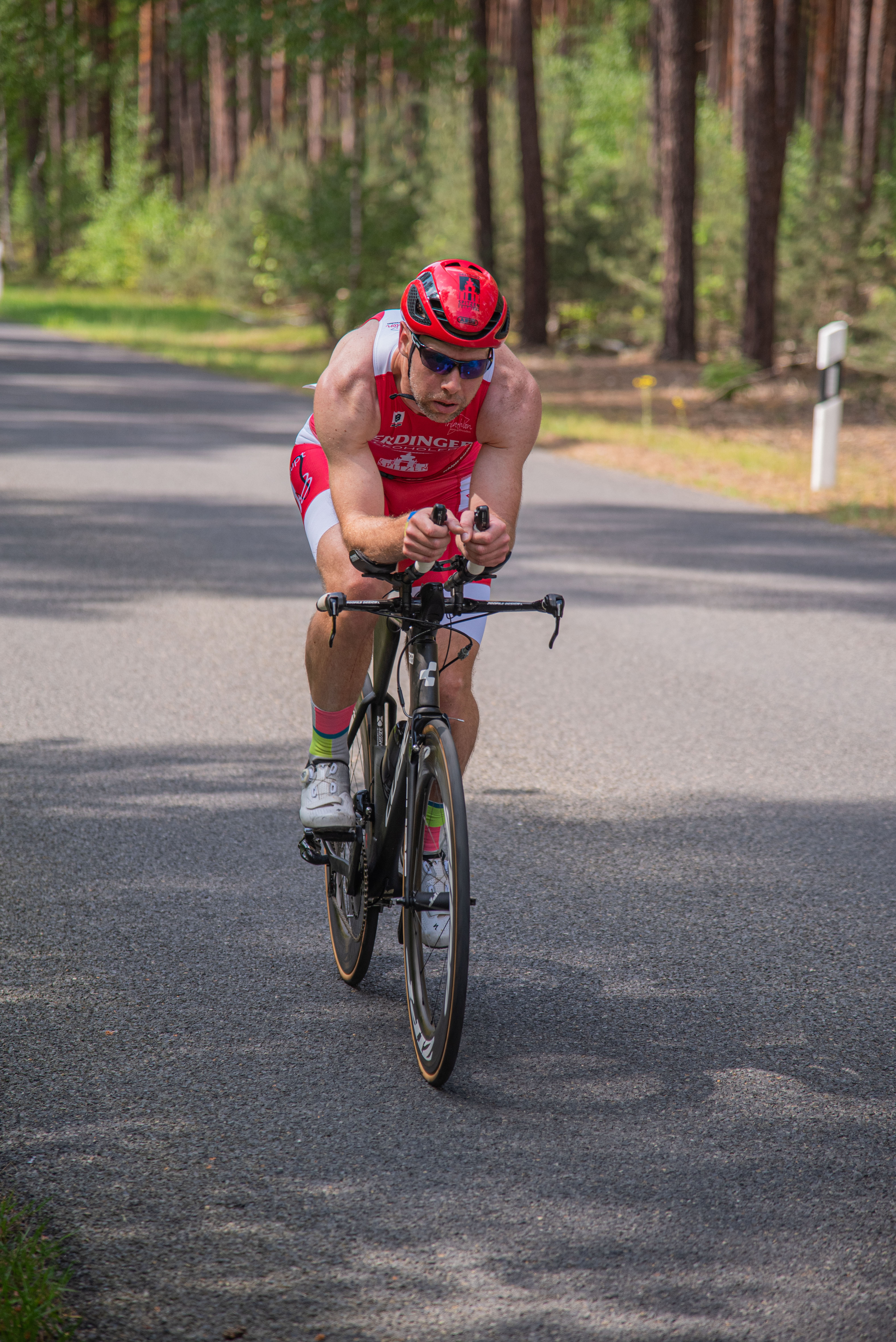 Nach den 10km Laufen ging es dann aufs Rad. Auf der Radstrecke gab es Windschattenverbot, sodass wir mit den Zeitfahrrädern über die Landstraße düsen konnten. Die Radstrecke war nahezu flach, mit nur wenigen leichten Anstiegen. Auf der Hälfte der Radstrecke ging mir leider mein Trinkhalm verloren, sodass ich für den Rest der Radstrecke auf dem Trockenen saß. Das tat meiner Verpflegung nicht gut. Nach einer großen Runde durch Wälder und kleine Dörfer war die Wechselzone wieder erreicht.