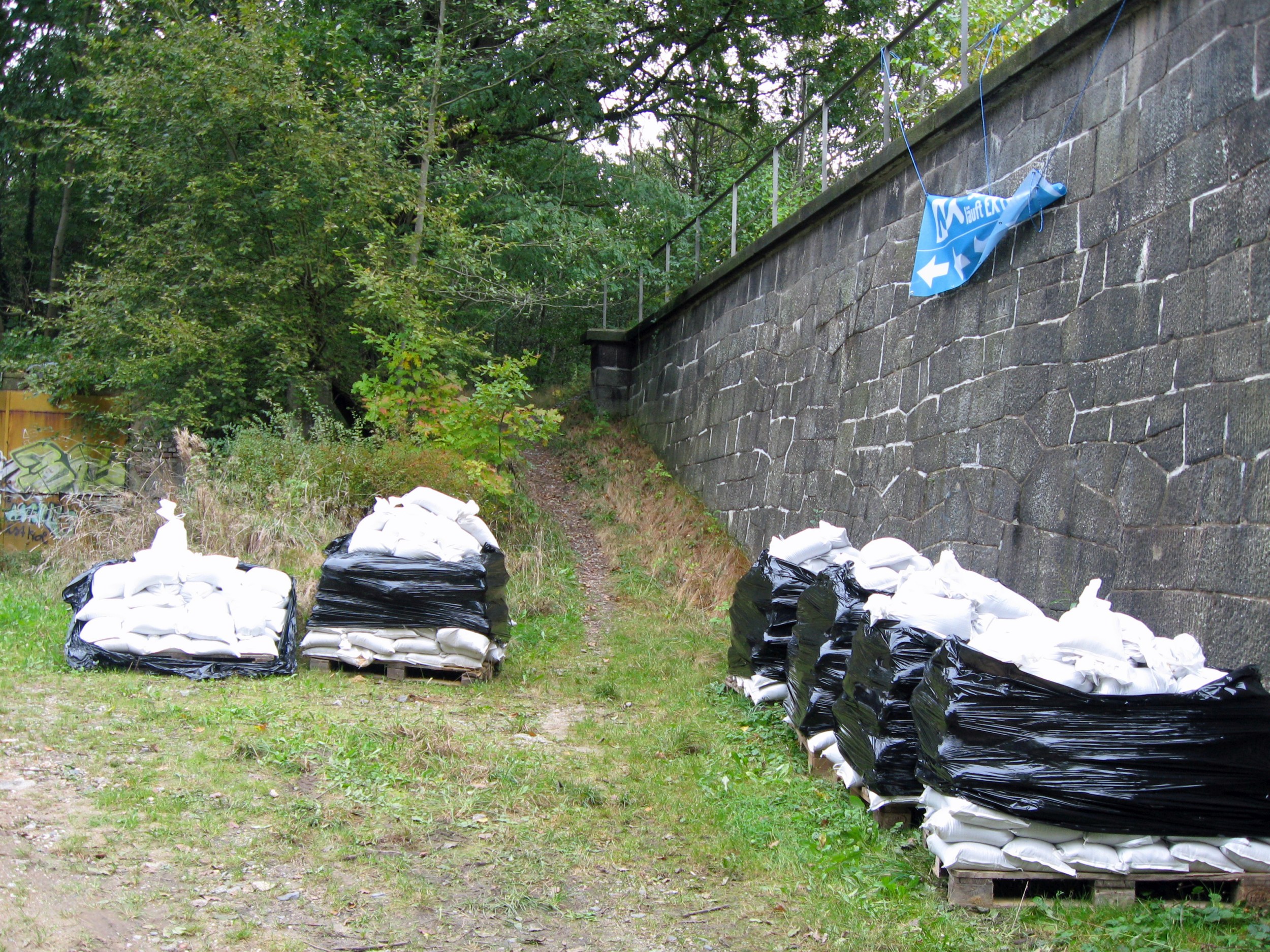 Jetzt konnten erstmal ein paar Meter gelaufen werden, bevor dann bei zwei kleinen Brücken über Bäche der Weg durch Reifen blockiert war. Hier hatte ich dann das erste Mal einen kleinen Stau bei der Hindernisüberwindung. Am Ende der zweiten Brücke ging es ein Gerüst nach oben und gleich wieder runter. Für den Weg nach unten waren Seile zur Hilfe angebracht, wobei ich mich dann doch für einen Sprung entschieden habe. OK, die Entscheidung war einfach; entweder ich warte kurz bis die Sportler rechts und links von mir herunter geklettert sind, oder ich nehme den schnellen Weg in der Mitte ohne Seile J Wenige Meter später durfte man dann einen Sandsack mitnehmen. Der Veranstalter hat wahrscheinlich nicht verstanden, dass Sandsäcke im Tal eher Wassermassen zurückhalten, als auf dem Berg. Hat alles nix geholfen, der Sandsack musste den Berg hoch. Alle 10 Meter stand freundlicherweise ein Hinweis, wie viele Meter noch zu absolvieren sind. Also nur noch 40, 30, 20, 10 – ups. auf dem nächsten Schild stand nur ein sorry verarscht und nochmal 50 Meter. Aber auch die gingen vorbei und danach konnten wieder mal ein paar Meter in Ruhe gelaufen werden.