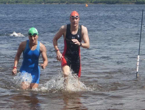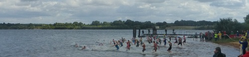 Nach kurzem frostigen Einschwimmen zitterten wir uns am Ufer „warm“ bis der erlösende Startschuß fiel. Ab rein ins Geprügel. Och, wie habe ich das vermisst: Ellenbogen, Unterarme, Fersen und Wasser in der Brille – Ich nahm sie alle mit! Spätestens nach der Linkskurve um die erste Boje, spürte jeder die Auswirkungen des Wetters. Schwimmen gegen Wellen ist eigentlich ein Heidenspaß bis zu dem Zeitpunkt, wo man Atmen will und eine Welle über einen rüberschwappt. Und schon hieß es raus aus dem Wasser die Treppe hoch nach rechts.