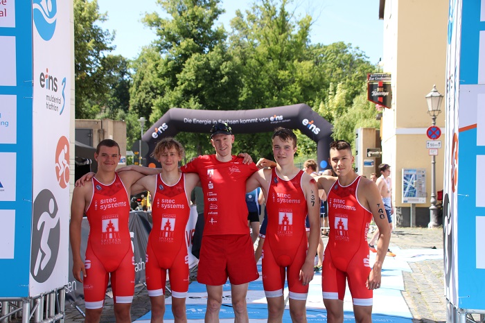 Zuerst aber, startete das Rennen der 2. Bundesliga Frauen, bei dem unser Team der SG Triathlon Team Thüringen / TV Dresden einen starken 2. Platz in der Gesamtwertung holen konnte. Der Start der Männer folgte im Anschluss um 10:10 Uhr. In Grimma starteten für das Dresdner Spitzen Triathlon Team Christian Pfeifer, Simeon Schumann, Neel Martius, Roman Kobylinski und Leander Scheer. Wie eigentlich immer galt ein bestmögliches Teamergebnis zu erzielen und dabei gleichzeitig möglichst viel Spaß zu haben.