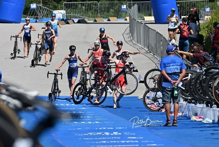 Der Weg zur Wechselzone war ziemlich lang, auch hier konnte ich ein paar Lücken schließen. Auf dem Rad galt es dann erstmal alles geben, um nicht alleine zu fahren und die Gruppe zu halten. Das gelang auch gut. Die Gruppe arbeitete dank Michelle Braun sehr gut zusammen. In Nürnberg saßen wir auch schon zusammen in der Gruppe, daher freute ich mich, dass es am Schliersee wieder geklappt hat. Bis zum Fuß des Anstieges wurde die Gruppe immer größer und arbeitete gut zusammen. Ich versuchte mich weiter vorn in der Gruppe zu positionieren, als es in den Berg ging. Alle Athletinnen schnauften und traten kraftvoll in die Pedalen. Die Schweißperlen kullerten übers Gesicht und als ich mich das nächste Mal umdrehte sah ich, dass unsere Gruppe nur noch aus 5 Mädels bestand. Das beflügelte mich und so schafften wir sogar den Anschluss an die nächste große Gruppe. Das Ende des Anstieges war mit einem Redbull Bogen gekennzeichnet und ich wusste, dass es dann erstmal bergab ging.