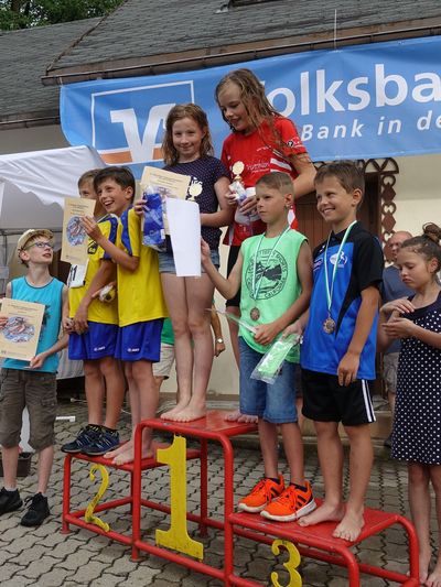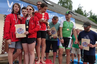 Trotz dunkler Gewitterwolken und Platzregen waren wir in Sebnitz sehr erfolgreich. Bei schwülheißem Wetter hatten es die Schwimmer im Sebnitzer Freibad noch am besten. Bei Gegen- wind und Hitze mussten unsere Radfahrer fahren und die Läufer bei Hitze oder später auf nassen Wegen laufen.