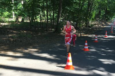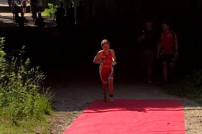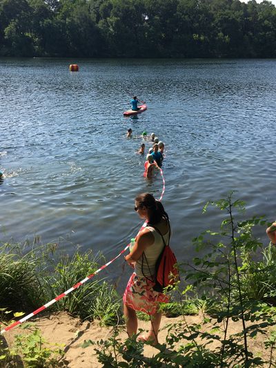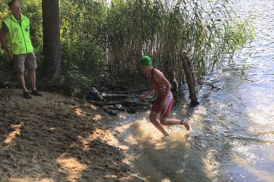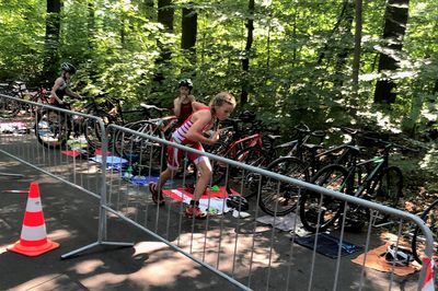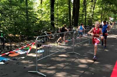 Das Schwimmen lief bei allen eigentlich ganz gut, auch wenn das Wasser ganz schön trüb war. In Berlin ist der Weg vom Wasser zum Wechselgarten sehr weit, inklusive Anstieg und Autobahnunterquerung.