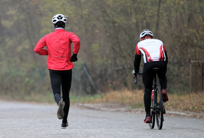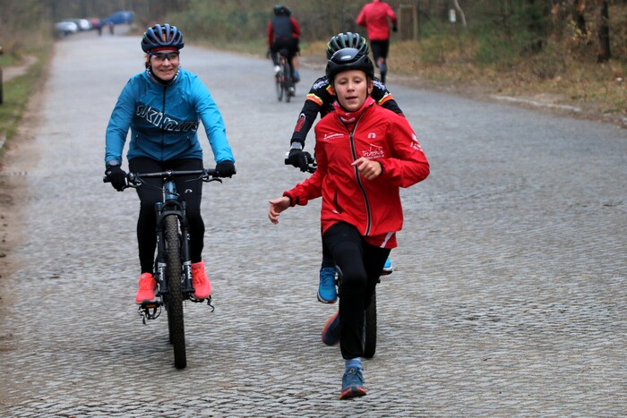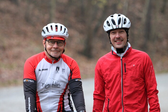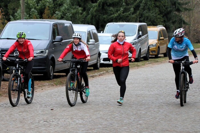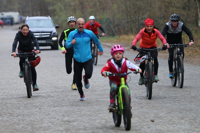 ... um im Abstand von fünf Minuten auf die 17,7 km lange Strecke zu starten. Die Mannschaften bestanden aus zwei bis vier Menschen unterschiedlicher Alters- und Leistungsklassen. Bei strahlendem Sonnenschein und herbstlichen Temperaturen bewegte sich je ein Mannschaftsmitglied laufend fort, während die übrigen Mannschaftsmitglieder auf Rädern versuchten hinter her zu kommen. Die Wechsel waren genauso individuell, wie die Laufgeschwindigkeiten und konnten frei eingeteilt werden. Während einige Mannschaften mit Messern zwischen den Zähnen unterwegs waren, ließen es andere besinnlicher und gemütlicher angehen. Die Runde führte über den Kannenhenkel, über die Hofewiese und den Prießnitzgrund zurück Richtung Marienallee. Landschaftlich und atmosphärisch immer auf höchstem Niveau, war die Strecke bis zur Hälfte auch etwas hubbelig.