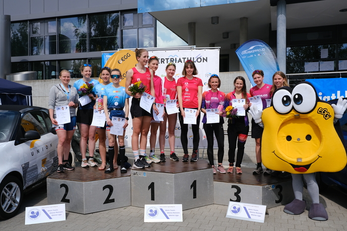 Nachdem wir alle die Nacht gut überstanden hatten, ging es an die Vorbereitung der Wechselzonen und anschließend zurück in die Schwimmhallen. Da die Männer als Letztes an den Start gingen, nutzen wir die Zeit, um gemeinsam die Frauen und Masters anzufeuern. Kurz darauf war es endlich so weit, wir gingen an den Start. Mit einem Rückstand von ca. 4 Minuten zum ersten Platz startete Tim als Erster von uns dreien, danach Robert und zum Schluss ich. Da die erste Wende mit Leine tauchen schief ging, waren die beiden auch erstmal weg. Was für mich bedeutete, noch einmal alles zu geben und aufzuholen. In den letzten 100 m konnte ich dann endlich wieder meine Gruppe erreichen.