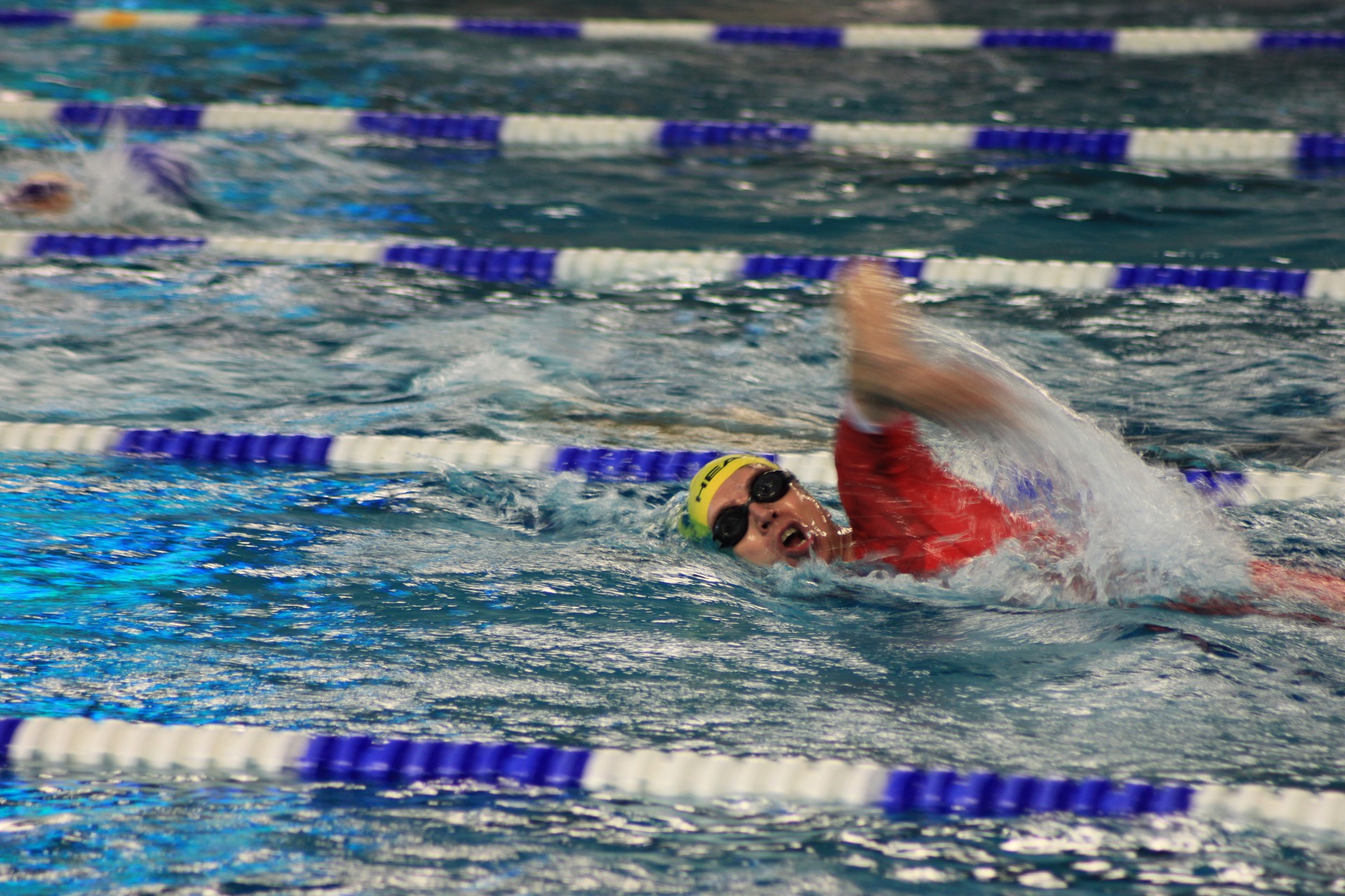Erste Disziplin Schwimmen: Geschwommen wurde indoor in einer recht modernen und schönen Schwimmhalle mit 50 m Becken. Es ertönte die Durchsage „Start in less than 30 seconds“ und ca. 1-2 gefühlten Sekunden später der Startschuss. Dass der Startschuss dann so schnell kam, da war ich nicht vorbereitet. Ich hantierte zu der Zeit noch mit meiner Uhr herum. Start also leider völlig verschlafen. Macht nichts. Hab dann noch ordentlich aufgeholt und bin als erster aus meiner Bahn nach 700 m rausgeklettert.