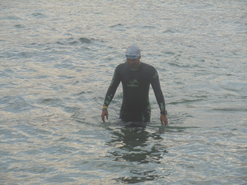 Am Folgetag ging es früh um 04:30 Uhr raus, da der Wettkampf bereits um 08:00 Uhr startete und noch 75 bergige KM zum Wettkampfort zurückzulegen waren. Dort angekommen, wurde noch letzte Hand an die Radwechselzone angelegt, sowie die 2. Wechselzone vom Rad zum Laufen eingerichtet. Anschließend wurde der Neo übergestreift und eingeschwommen. Dies war die 1. Berührung mit Salzwasser in einem Wettkampf, da Rügen 2014 leider zu einem Duathlon degradiert wurde.