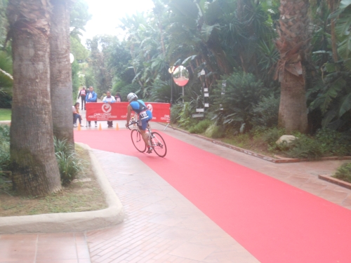 Diese verlief zunächst auf einem roten Teppich durch die Ferienanlage, bevor die vollgesperrte Radstrecke erreicht wurde. Diese führte dann weiter zu einem 6km entfernten Kreisverkehr als Wendepunkt und folgte hernach im Anschluss wieder vorbei am Start in die Berge. Hier war zunächst ein gemütlicher Anstieg über ca. 400hm und 14km Länge zu bewältigen, der dann in eine rasante Abfahrt mündete. Dann ging es wieder hoch, allerdings mit bedeutend weniger Höhenmetern, zu einer Militärbasis. Hier war dann ein Verpflegungspunkt, an dem die Soldaten selbst mit die Verpflegung reichten und meine Frau mit Fotoaperat stand.