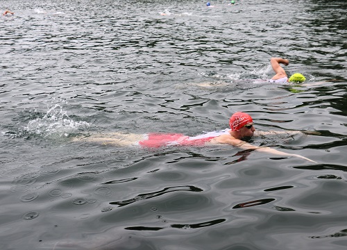 Christian entstieg als schnellster Schwimmer den Fluten der Louise. An seinen Fersen hatte sich Markus Thomschke geheftet, der aber in bester Langdistanz-Handlungsweise in der Wechselzone Socken anlegte und den Wechsel insgesamt mächtig zu genießen schien. Vermutlich wollte er nur mit Christian spielen und ihm einen schönen Vorsprung verschaffen... Marvin hatte auf der zweiten Schwimmrunde den Anschluss an dieses Duo etwas verloren, wechselte aber blitzschnell und war ratz-fatz auf der Verfolgung. Der Rest hatte sich gut im Feld verteilt, so dass es den mitgereisten Ultras der Gruppierung "Eierschecke" nicht langweilig wurde.