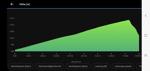 Nachdem die Bedingungen als gut und die letzten 1000 hm hinauf als ziemlich hart zu bezeichnen waren, ging ich doch Recht zufrieden aus der Nummer heraus. Insbesondere die unberechenbare Größe: „Höhenverträglichkeit“ hatte keinen Strich durch die Rechnung gemacht.