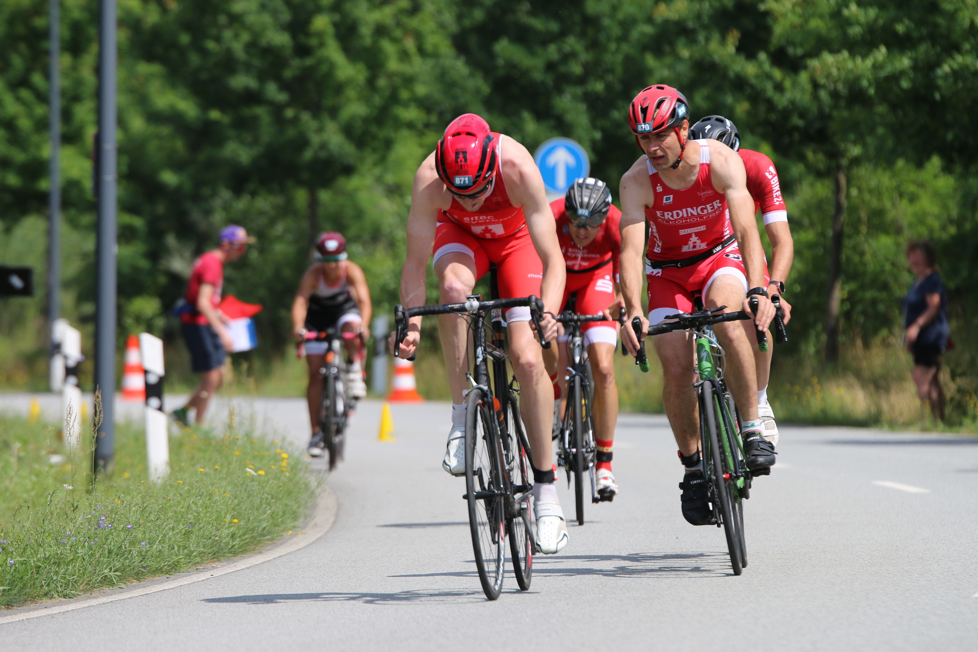 Zunächst galt es ein Mannschaftszeitfahren über 40km (Männer) bzw. 20km (Damen) auf einem welligen Kurs zu absolvieren. Dabei konnte sich die 1. Männermannschaft bestehend aus Stephan, Marco, Marvin und mir (Robert) mit ca. 2min Rückstand auf die führende Mannschaft aus Weimar eine gute Ausgansposition für die anschließende Swim&Run Staffel sichern. Extramotivation gab es zu Beginn unserer 2. Radrunde. Hier trafen wir die eben gestartete Damenmannschaft, bestehend aus Pauline, Sophie und Manu, welche später mit 35s Rückstand auf das Team „maxx-solar Triathlon Thüringen/TV Dresden“ von der Radstrecke gingen. Die 2. Männermannschaft (Carsten, Otto, Grahlo, Christian) erreichte trotz zweifachem Verfahren mit nur etwa 5min Rückstand Rang 7 (von 12) beim Radfahren.