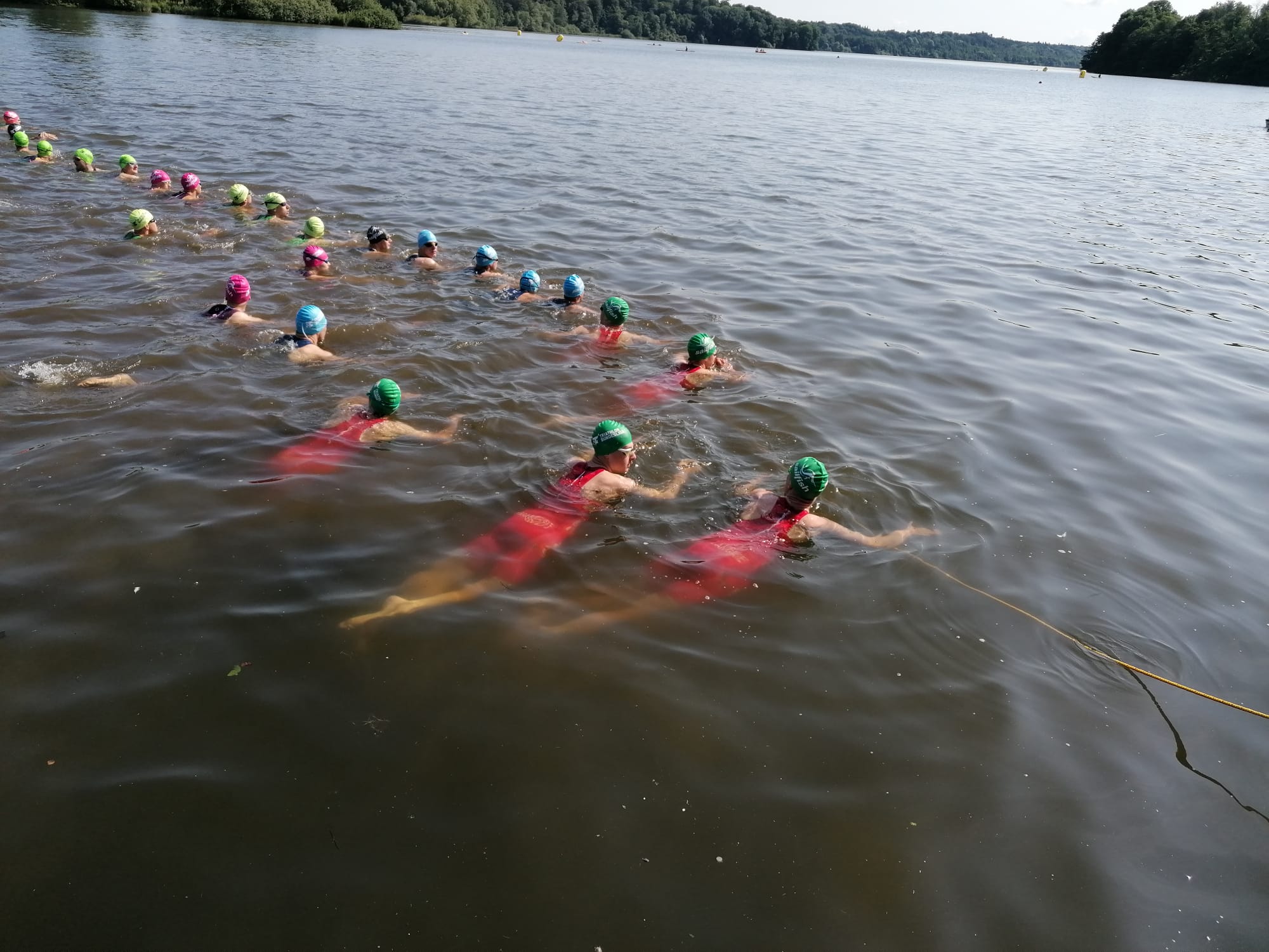 Als wir nun als Team aufgefordert wurden uns an die Startlinie im Wasser zu positionieren, wurde es ernst. Der Start verzögerte sich einige Minuten, da einige Teams die Leine im Wasser immer weiter nach vorn drückten und so vor der festgelegten Startlinie waren. Dann ging es los. Das Anschwimmen war hart, die Geschwindigkeit hoch. Nach einiger Zeit, ungefähr nach der 2. von 4 Bojen, nam sie jedoch ab. Die perfekte Chance den Anschluss an die vordersten Schwimmer zu erreichen.