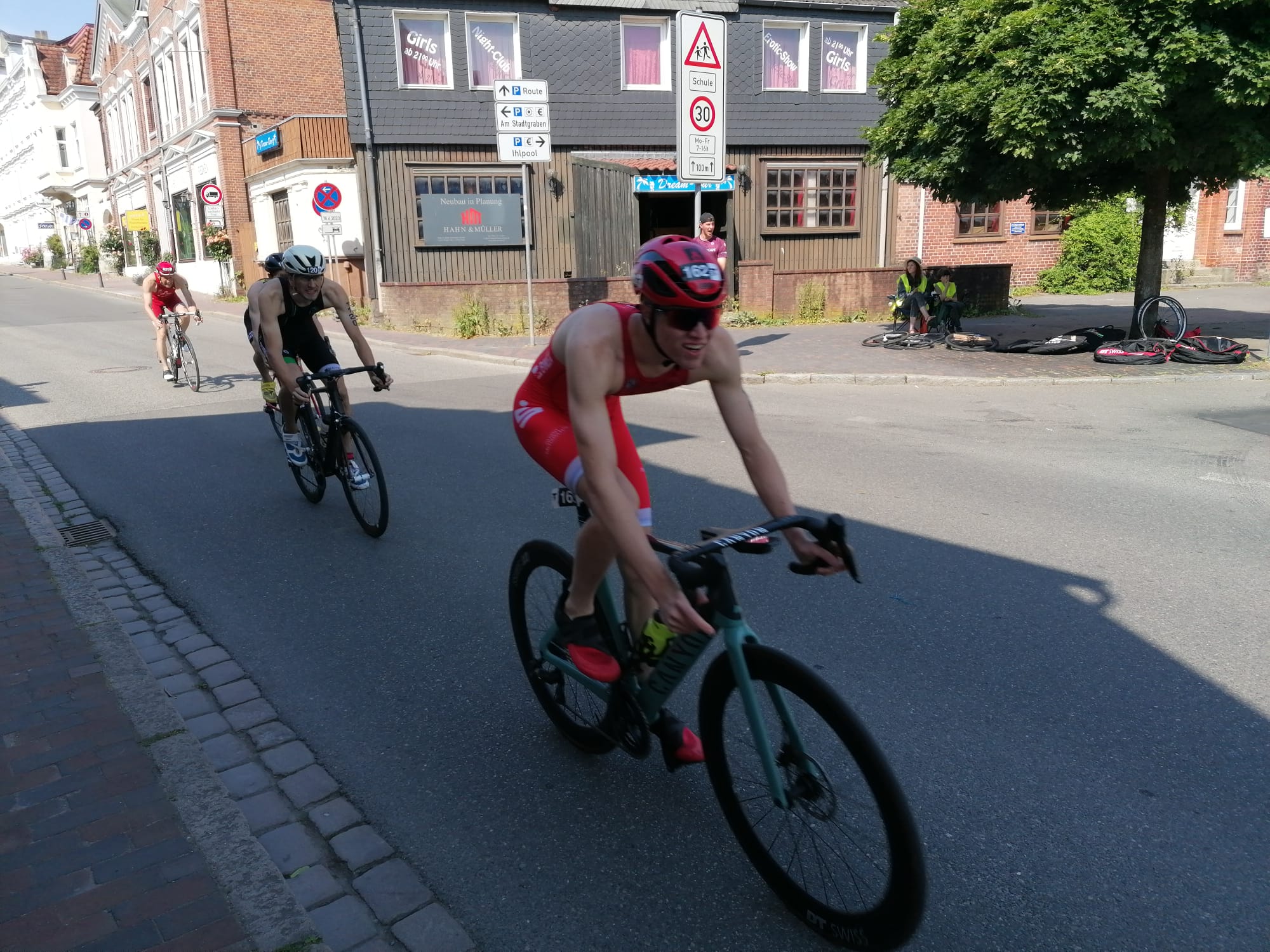 Die Radstrecke war definitiv nicht leicht. Viele Abfahrten, Auffahrten und Antritte nach den Wendepunkten haben gut an den Körnern gezogen. Nach ungefähr 2 von 6 Runden hatte sich eine große Gruppe von ca. 30 Mann gebildet. Mit dabei waren Jonah und Kjell, die zusammen als Gruppe versuchten die Führungsgruppe einzusammeln und dies dann schlussendlich auch geschafft haben.