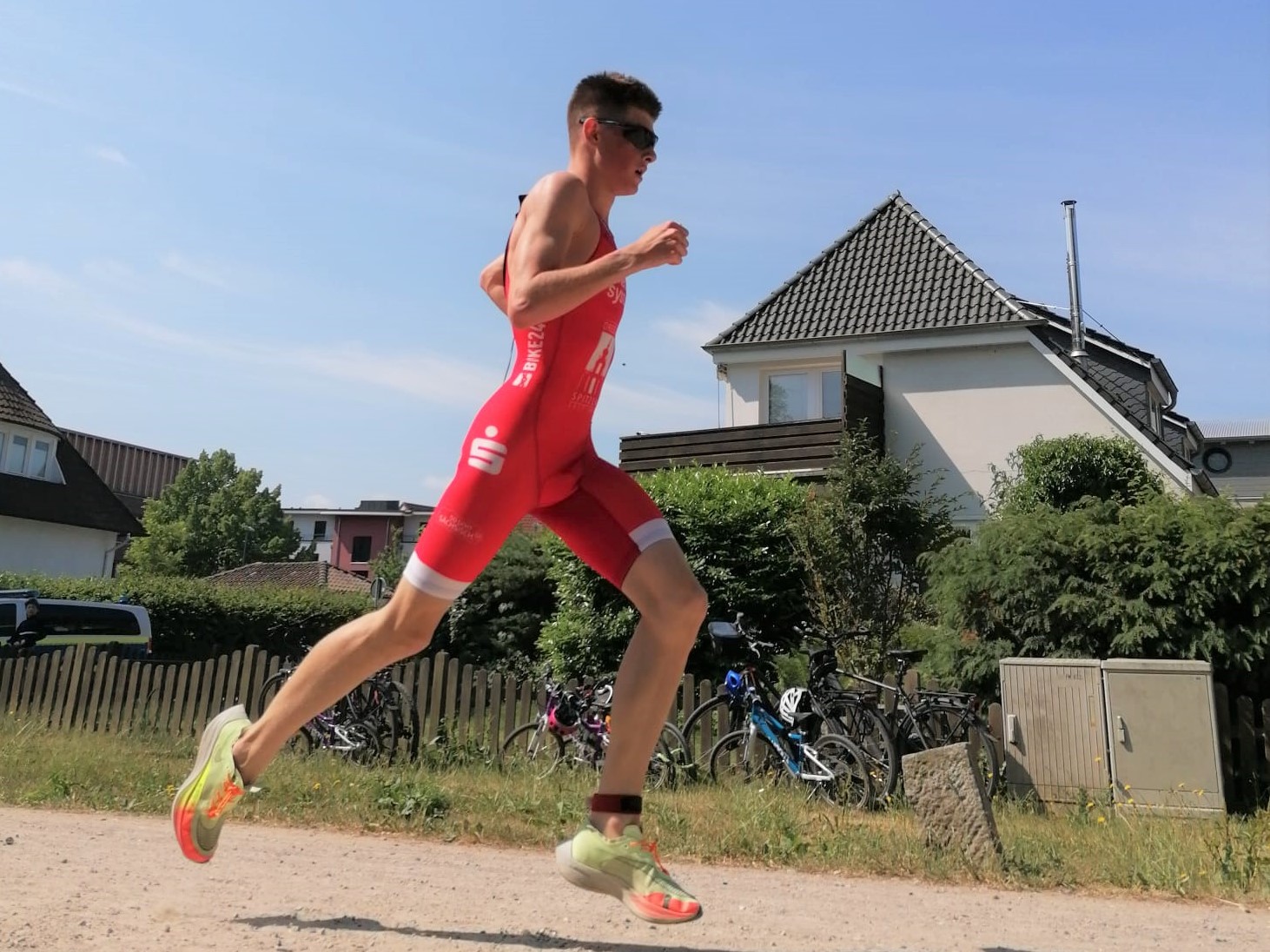 Das Problem bestand nun aus einer sich ziehenden Wechselstrecke, in der man eng beieinander mit seinem Fahrrad in die Wechselzone rennen musste. Ein großer Stau der sich in der großen Gruppe bildete, hat einiges an Zeit gekostet. Oliver kam mit einer Minute, Simeon und Max mit ca. vier Minuten Abstand zu den ersten, zum zweiten Wechsel.