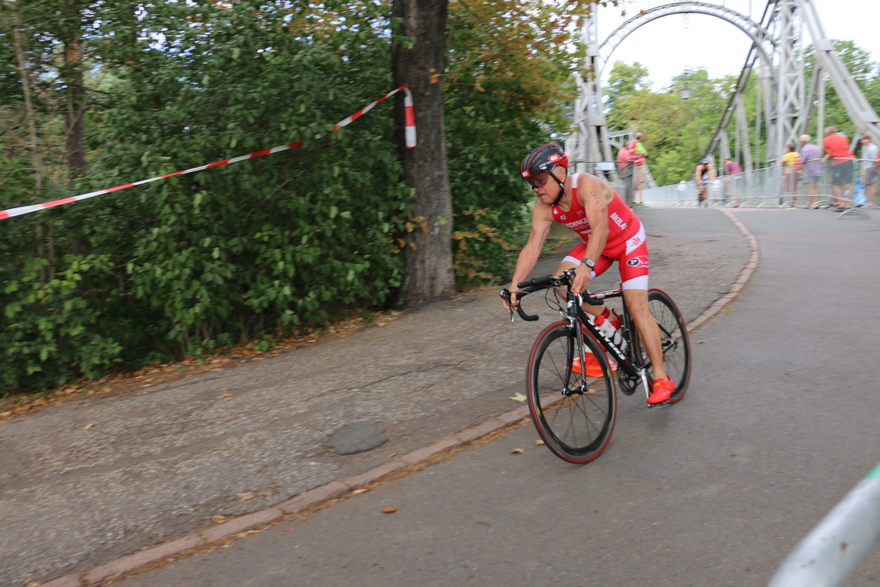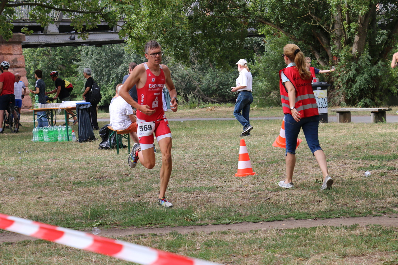 Nach dem Startschuss ging es für uns zunächst flussabwärts in der Saale bis zum Wendepunkt und anschließend wieder einige Meter stromaufwärts bis zum Schwimmausstieg. Endlich hatte ich mal ein richtig gutes Schwimmen. In der morgendlichen Sonne war das Schwimmen im Fluss ein toller Einstieg in den Wettkampf. Auf dem Rad angekommen ging es sofort ans Eingemachte. Die Radstrecke, eine 5km Runde, die es viermal zu fahren galt, war sehr kurvig und teils mit rauem Straßenbelag bestückt. Eine solche Strecke ist sicherlich nicht jedermanns Geschmack, ich kann nur sagen: es hat richtig gefetzt. Zugleich möchte ich eine derartige Strecke jedoch nicht unbedingt bei Regen fahren. Beim Radabstieg lag ich mittlerweile auf Platz 2, direkt hinter mir kam auch schon Marco angeflogen. Beim Laufen gibt es in so einer Situation eigentlich nur eine Devise: laufen was das Zeug hält. Sowas in der Art habe ich dann auch gemacht, leider konnte ich einen fliegenden Berliner nicht halten. Am Ende reichte es damit für den 3. Platz. Wieder auf dem Podium der Regio, jawoll! Im Ziel hieß es dann warten auf die nächsten roten Einteiler. Die kamen in Form von Marco und Robert auch innerhalb kurzer Zeit eingelaufen. Das Team der Friesen Weltraumjogger war an diesem Tag jedoch nicht zu schlagen und so landete das unser Männerteam 1 auf dem 2. Gesamtrang. Das zweite Männerteam kam im Mittelfeld auf Rang 6 an.